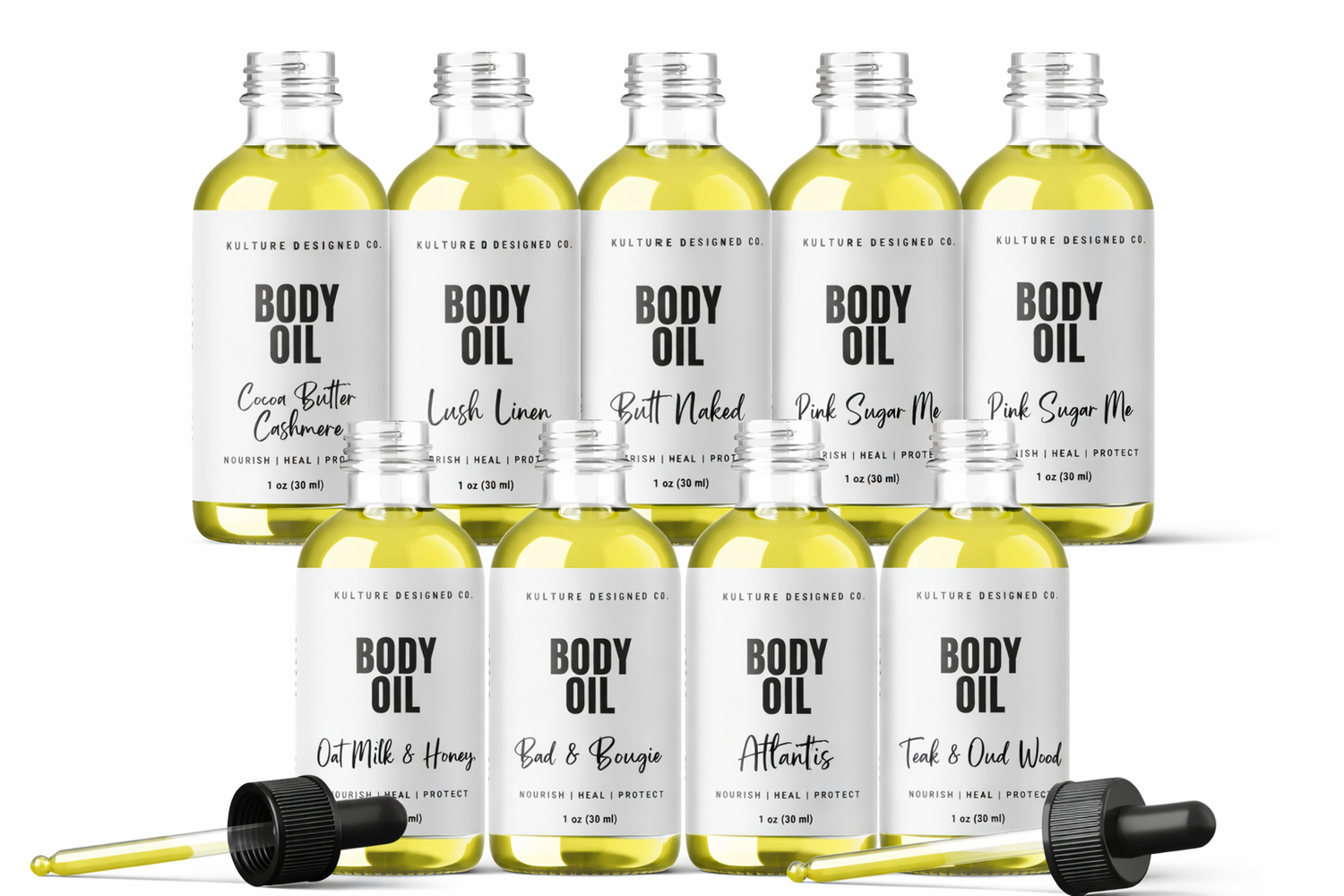 Upgrade your glow routine with the Kulture Designed Co. Body Oil Bundle — your skin’s new favorite self-care ritual. Choose multiple scents, layer your favorites, or grab a variety to match every mood. Our lightweight, deeply hydrating body oils lock in moisture, leave a silky glow, and keep your skin smelling irresistible all day.
